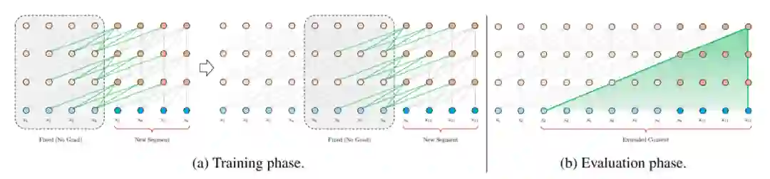 在训练的过程中,当处理新的Fragment的时候,之前计算的hidden_state已经被修补存储起来,会作为context信息来进行重用。虽然训练梯度依旧只在一个fragment之间流转,但过去的历史信息是可以实实在在传递到新的fragment训练中。