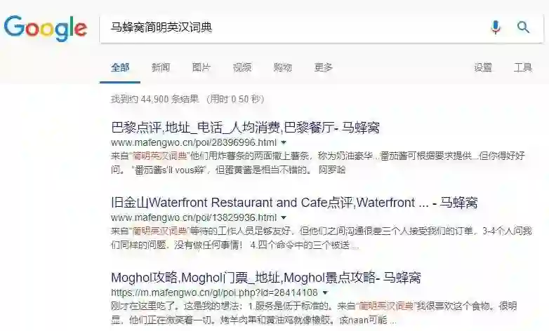 随后记者在谷歌搜索“马蜂窝简明英汉词典”,出现了三条带有“来自简明英汉词典”的马蜂窝点评。