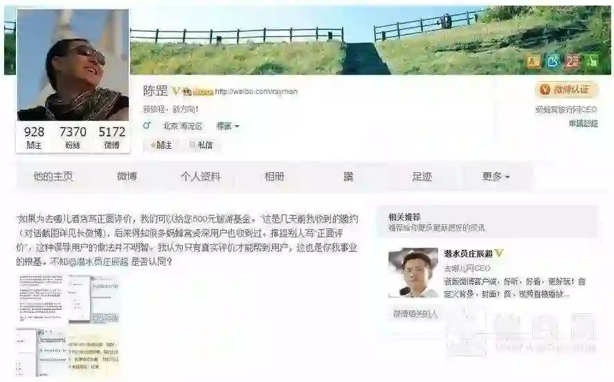 2014年,携程网和去哪儿尚未合并,蚂蜂窝CEO陈罡在微博公开炮轰去哪儿通过虚假评论造假,认为去哪儿的刷评行为已经动摇到了行业诚信的根基,但去哪儿未对此进行公开回应。
