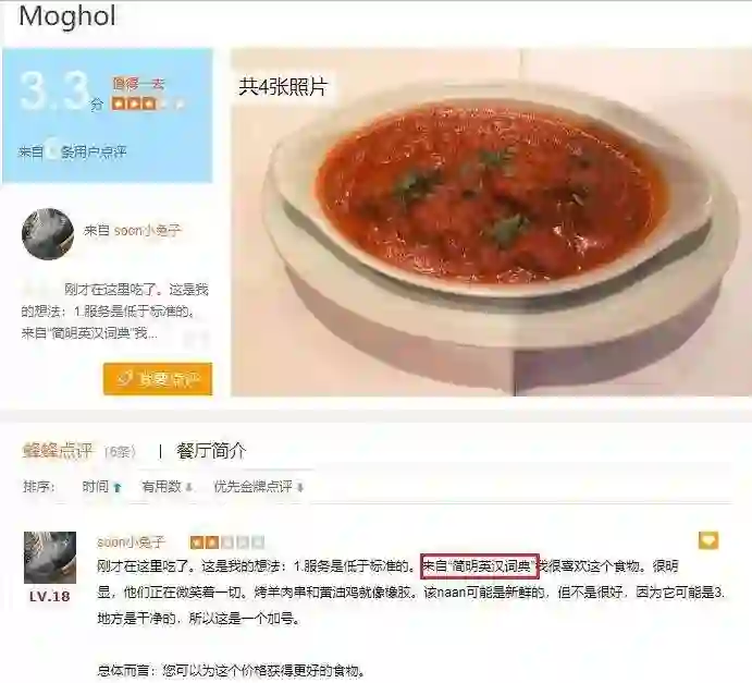 文章指出,马蜂窝点评中出现了很多自相矛盾的情况,比如同一个用户用不同性别点评,以及同一时间在不同地点点评。另外,部分点评的内容中还保留着“大众点评”、“携程”、“美团”等字样,部分内容甚至是翻译自其他类似Yelp的英文平台,“简明英汉词典”的字样都没有去除,粗暴搬运的痕迹明显。除此之外,点评中还有一些明显错误的内容,文章称是马蜂窝不慎把不该抓取的内容抓了进来。
