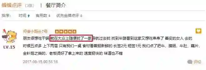 根据文中提供的马蜂窝抄袭自美团等平台的点评截图,记者21号上午11点分别在上述提到的九个商家点评中进行查看,在“花串串财富广场店”的点评区中,发现一条显示着“就在大众上随便找了一家”的字样;在“宝贝饭堂”点评区中,有一条写着“第二天的午餐美团上点”。其他商家的评论区未发现文章截图显示的情况。