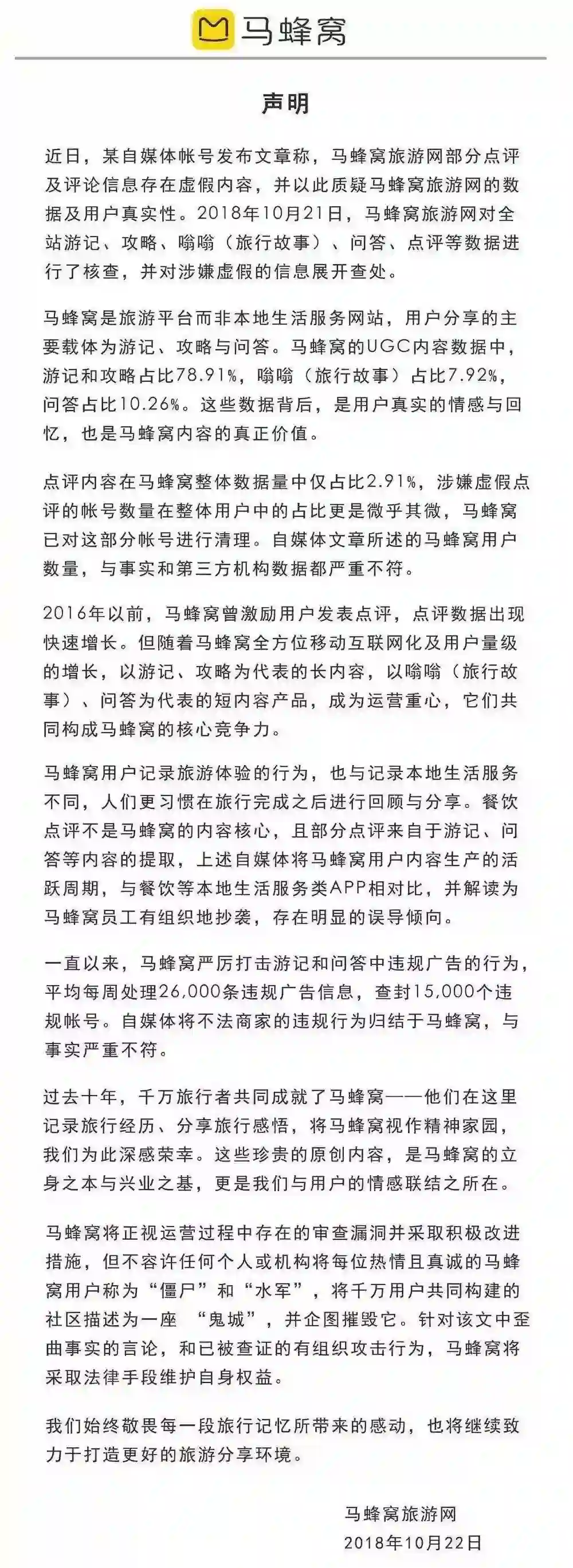 针对质疑,22日早上马蜂窝发表声明,称对全站游记、攻略、嗡嗡(旅行故事)、问答、点评等数据进行了核查,并对涉嫌虚假的信息展开查处。自媒体文章所述的马蜂窝用户数量,与事实和第三方机构数据都严重不符。