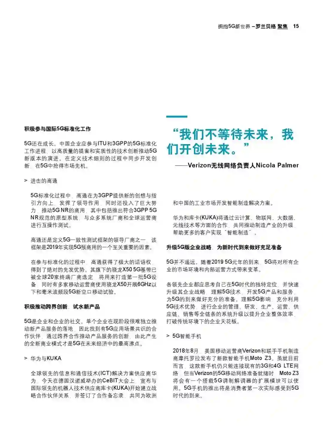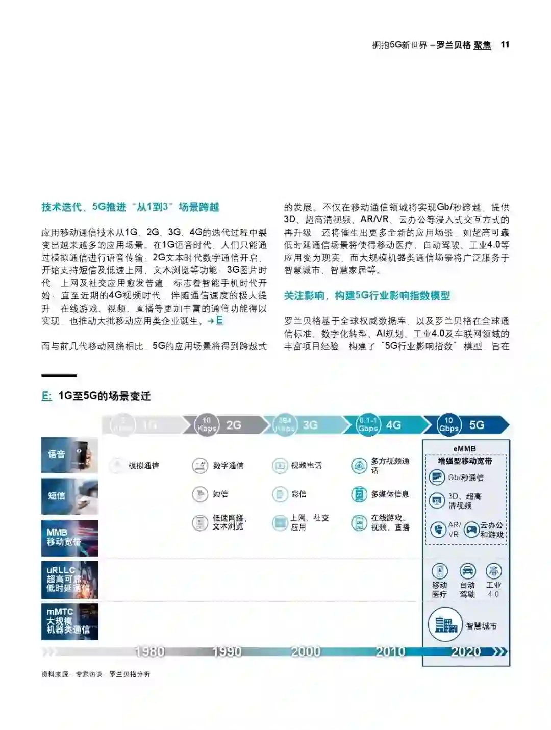 在报告中,我们聚焦“5G引领行业突破”的“工业4.0”,“5G激发行业创新”的“远程医疗”及“5G推进行业增值”的“VR/AR”三大应用领域,针对5G对该行业带来的改变、该领域企业的最新进展进行剖析,同时罗兰贝格也已经积极参与到各行各业中,帮助企业打造5G时代的业务战略,以更好地拥抱变化、为新时代到来做好充分准备。
