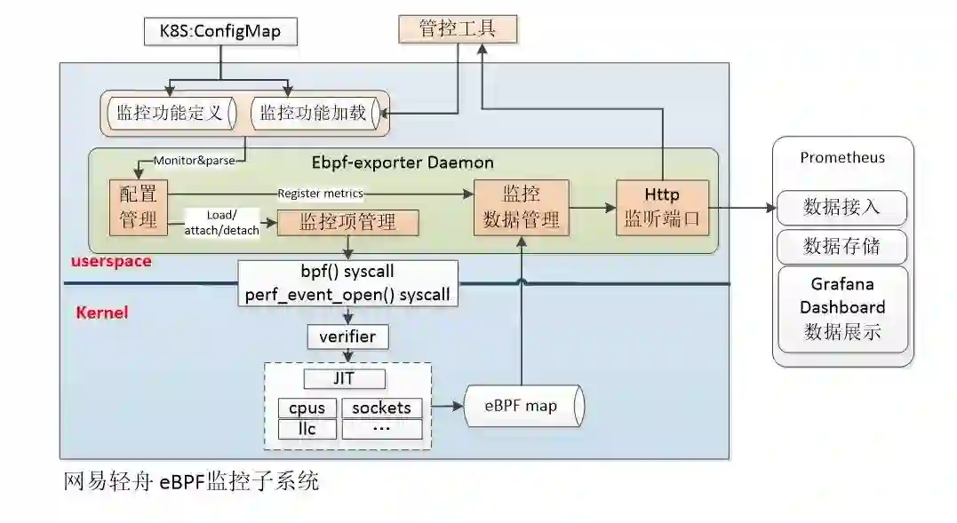 eBPF 监控子系统采用容器化部署,支持通过 K8s 部署和管理,监控数据通过 Prometheus 进行持久化存储并通过 Grafana 进行展示。eBPF 监控子系统具备如下特性: