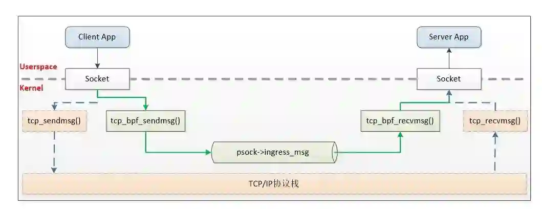首先我们监听 TCP 链接状态的变化,在连接建立时,填充 sockmap。然后我们再通过 eBPF 的 sk_msg 功能 hook TCP 的发包流程(sendmsg/sendfile 等),并在 hook 函数中调用 bpf_sockmap_redirect()对 socket 进行重定向。