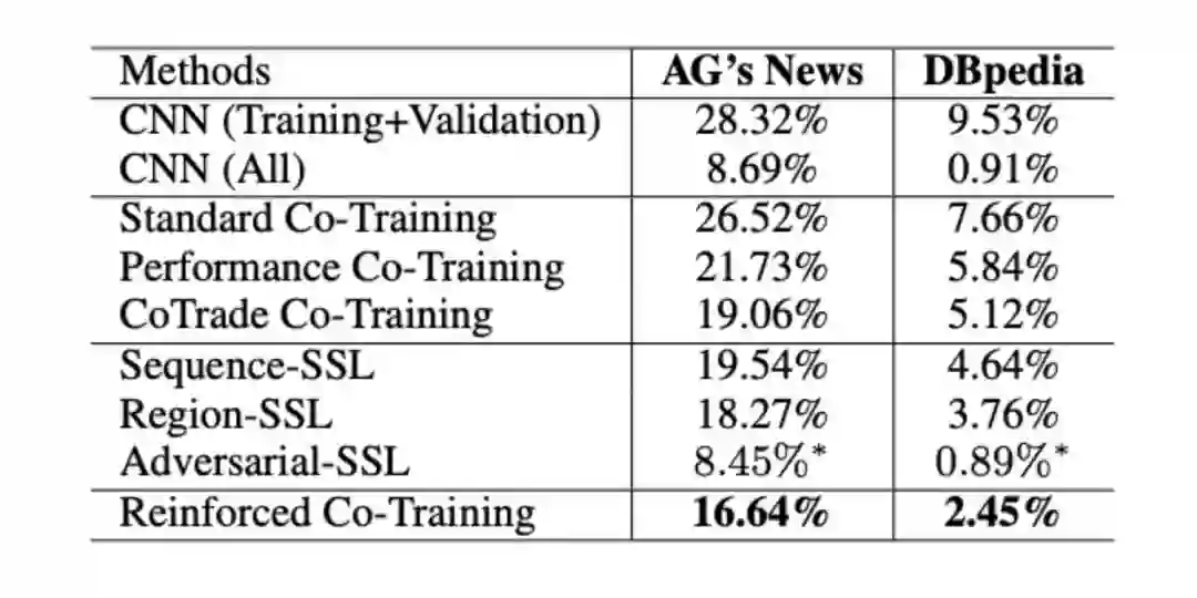 本文提出了一种新的方法——强化Co-Training,来选择高质量的未标记样本,以便更好地进行Co-Training。更具体地说,该方法使用Q-learning学习一个带有小标记数据集的数据选择策略,然后利用这个策略自动训练联合训练分类器。