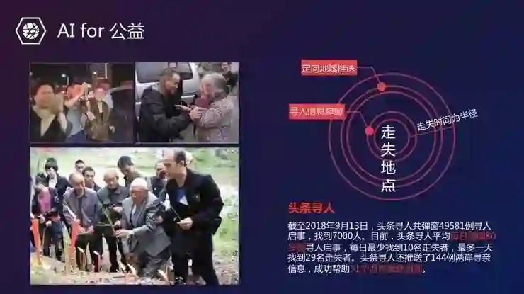 字节跳动将人工智能结合产品功能积极服务于公益,两年半时间成功寻回7254名走失者的“头条寻人”,这是一个典型的运用人工智能促进信息效率,进而服务公益的产品机制:结合智能推荐和地理推送技术,以走失者走失地为圆心,根据走失者行走速度等信息进行数据分析和计算,预估出可能的走失范围,在此范围内推送寻人信息,实现每条寻人信息的精准地理范围覆盖和人群触达,从而大大提高寻人成功率。