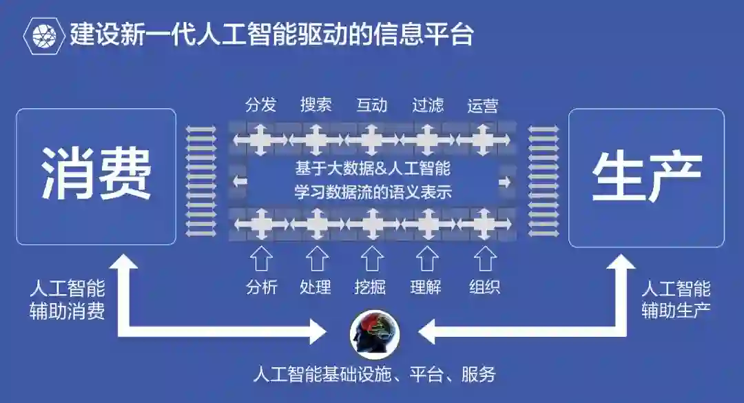 人工智能基础设施、平台与服务,基于大数据、人工智能学习数据流的语义表示,对信息进行分析、处理、挖掘、理解和组织,使得内容能够在分发、搜索、互动、过滤和运营方面变得更加智能,做到人工智能辅助消费与生产。