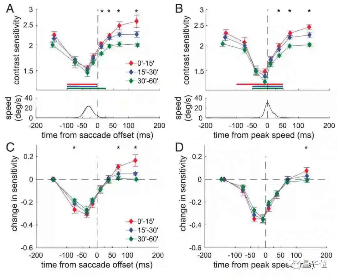 平均而言,在黄斑区域,微眼动结束后不到25毫秒的时间内,灵敏度已恢复到之前90%,之外区域也能在25毫秒内完全恢复。