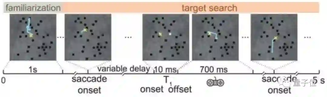 实验流程具体如下,其中黄色X是视线中心,青色线条是眼动: