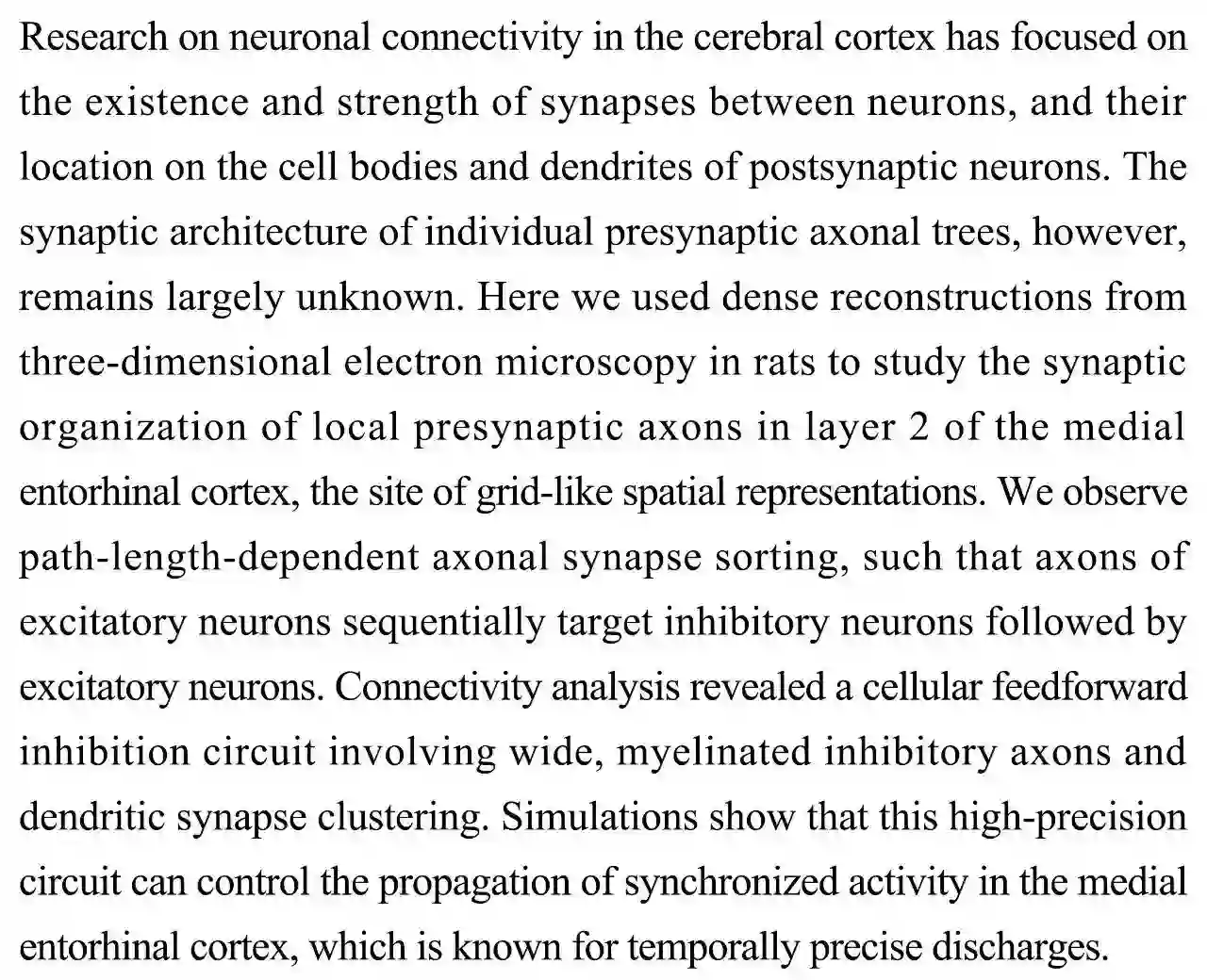 (导读 阿金)大脑皮层神经连接研究对单个突触前轴突树的突触结构尚不清楚。本研究使用三维电子显微镜密度重建研究了大鼠内侧内嗅皮层局部突触前轴突的突触组织,对轴突突触分配和连接性进行了分析。模拟实验显示了这种高精度的环路是如何调控内侧内嗅皮层中同步活动传递的。