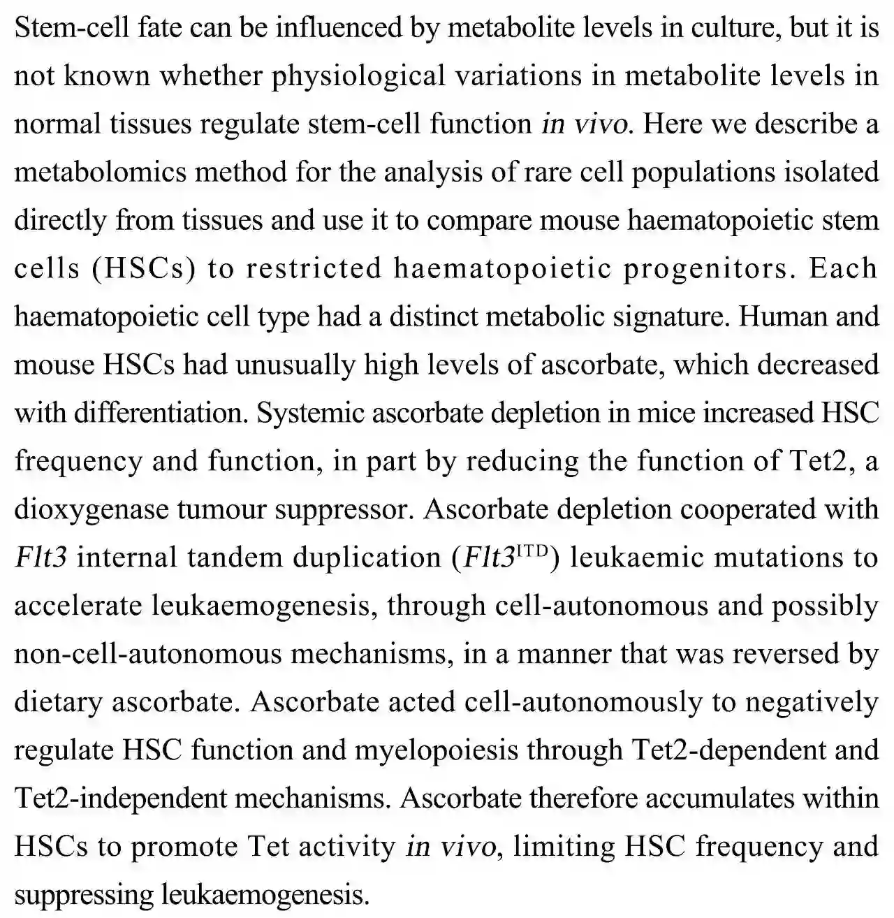 (导读 榴莲君)本研究发现生理状态下造血干细胞(HSCs)中富含抗坏血酸盐,且浓度随着细胞分化而逐渐降低。低浓度的抗坏血酸盐可通过或不通过 Tet2 途径来提高造血干细胞的分化能力,并可加快白血病的进程。表明适量增加饮食中维生素 C 的摄入或会减缓肿瘤的进程。