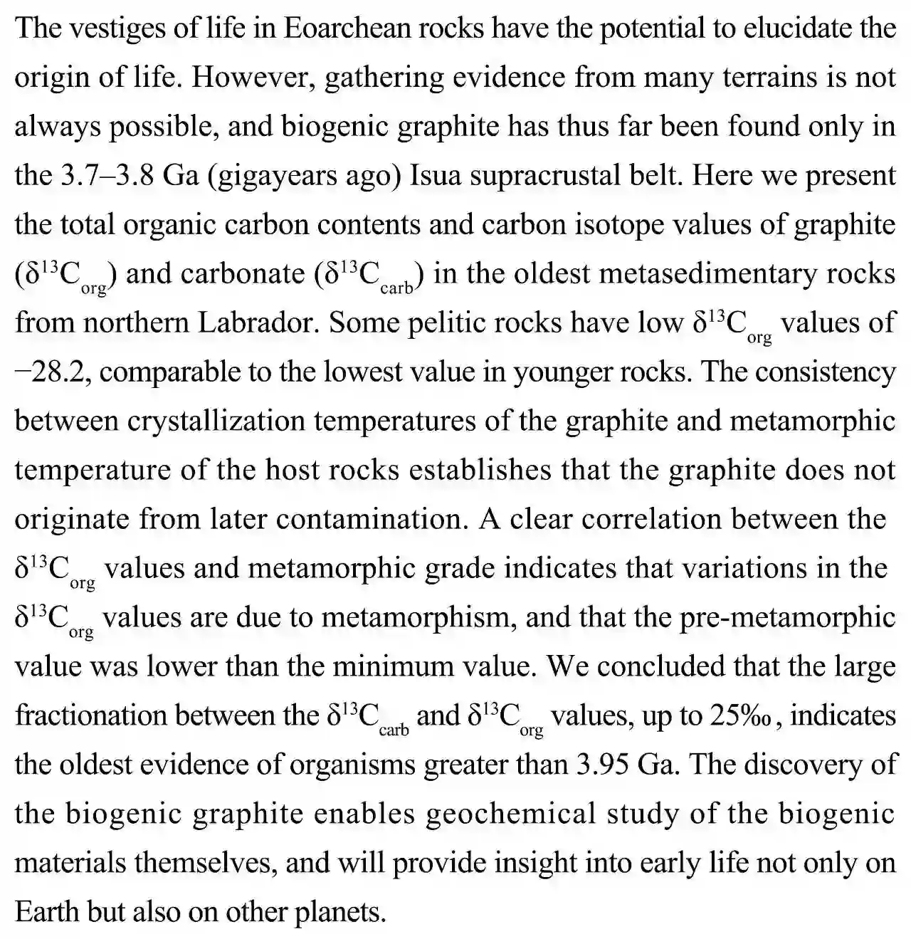 (导读 刘晓娟)本研究分析了北拉布拉多碎屑变质岩中的有机碳总量、石墨碳同位素(δ13Corg)和碳酸盐(δ13Ccarb)含量,显示泥质岩 δ13Corg 含量比新岩石低,石墨结晶温度和容矿岩变质温度的一致性说明石墨的产生不晚于岩石,δ13Corg 含量和变质程度的相关性表明变质导致了 δ13Corg 的变化。 δ13Ccarb 和 δ13Corg 的分异高达 25%,表明最古老的生命要早于 39.5 亿年前。