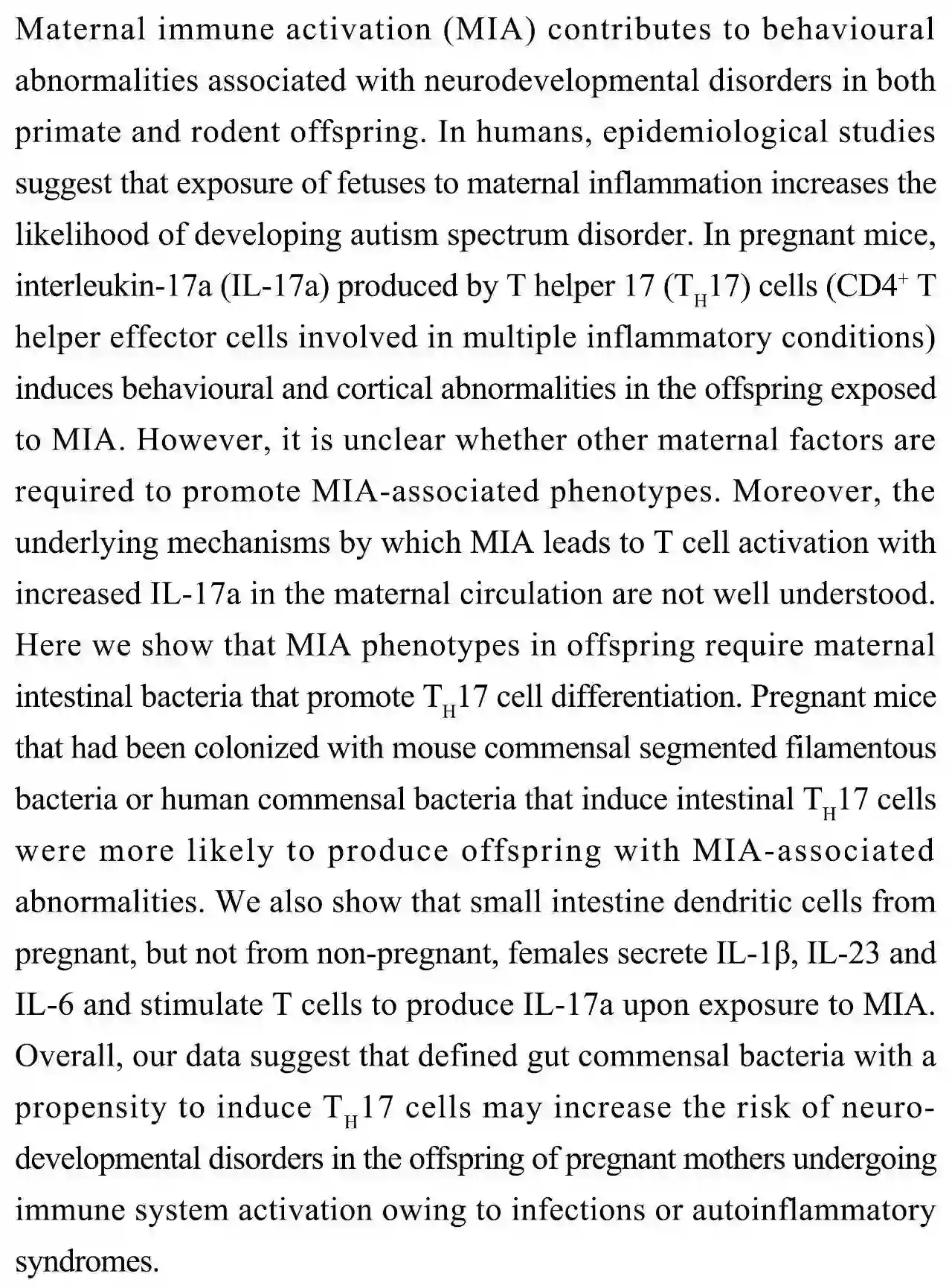 (导读 郭思瑶)母体免疫激活(MIA)可诱发子代神经发育紊乱导致的行为异常。科研人员发现 MIA 表型需要母体肠道细菌的参与来促进辅助性 T 细胞 17(TH17)分化。被移植了可诱导 TH17 的肠道菌群的怀孕小鼠更易产生 MIA 相关的异常子代。该发现表明肠道共生细菌具有诱发 TH17 的性质,可能会增加子代神经发育异常的风险。