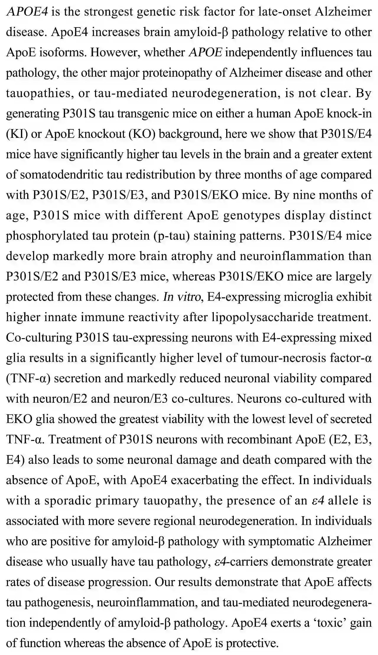 ApoE4 显著加剧 tau 蛋白病小鼠模型中 tau 介导的神经退化