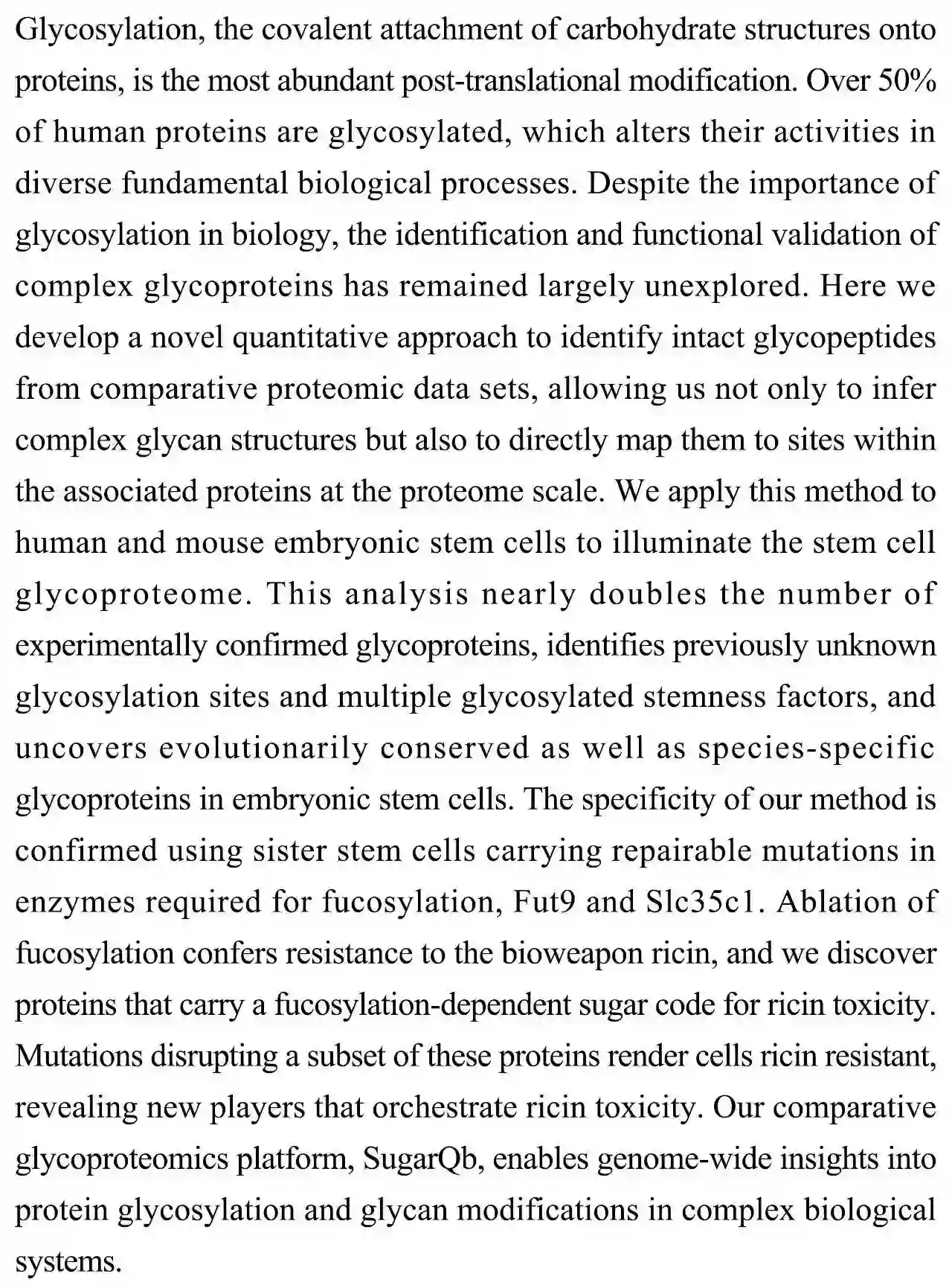 (导读 陈月欣)蛋白质的糖基化是最常见的翻译后修饰方法,可以使蛋白质的功能发生改变。我们利用比较蛋白组学发展出一种可以在蛋白组内定位活性糖肽的新方法,并用此方法对干细胞的糖蛋白组进行了研究,发现了一些此前未知的糖基修饰。研究还显示,某些蛋白的岩藻糖化与蓖麻毒素的毒性有关。
