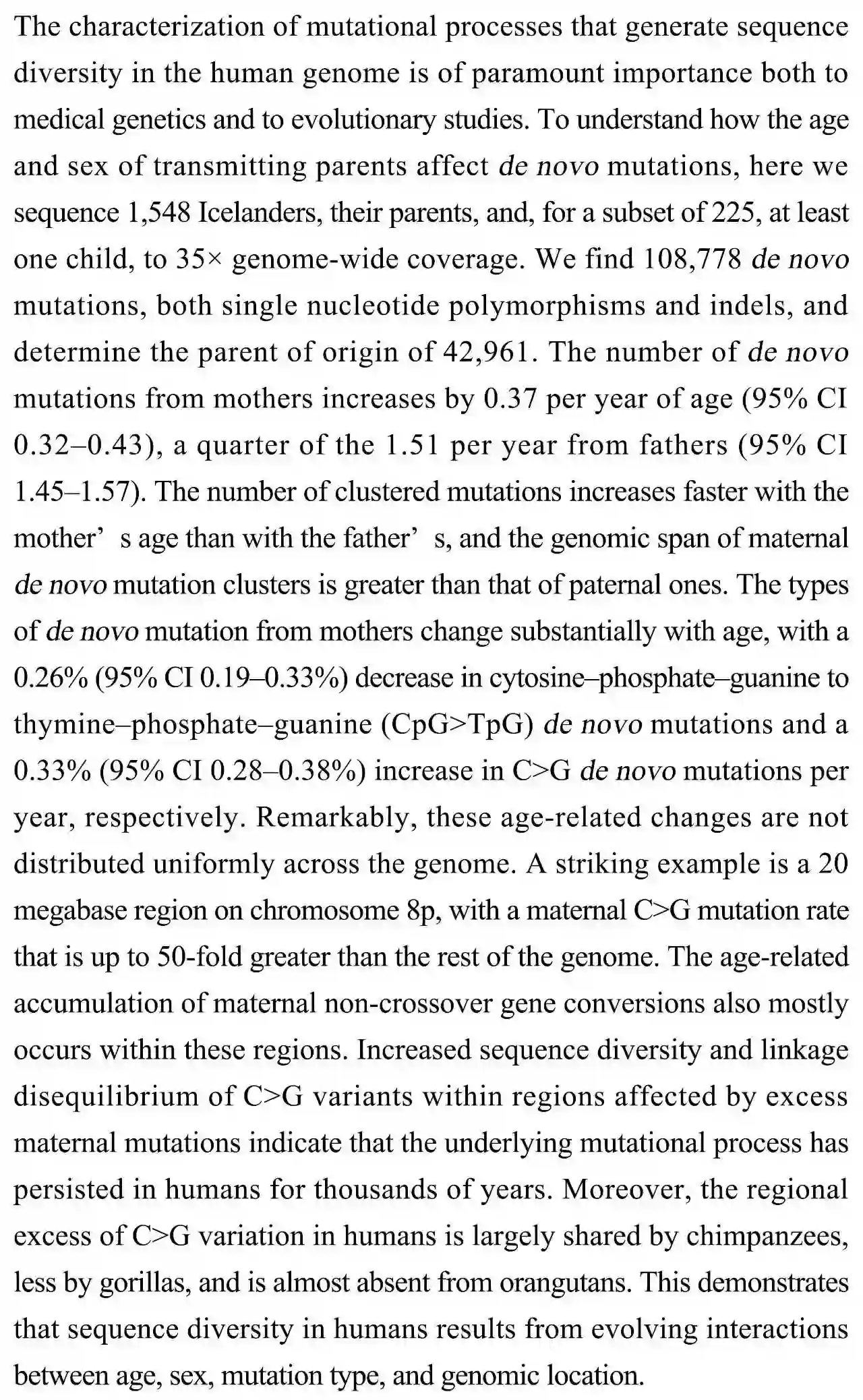 (导读 阿金)人类基因突变过程中产生的差异是遗传医学和演化研究的重点对象。本研究团队对冰岛人开展了全基因组序列分析,在 1548 名个体中鉴定出了高质量自发性遗传突变(DNM)并对确定父母来源的突变进行了分析,发现父亲年龄越大,子女的 DNM 发生频率越高,而簇状突变数量增长则更多来自母亲年龄增长的影响。突变的类型也与父母年龄相关。该研究对父母年龄和性别因素在基因突变中的作用有了新的认识。