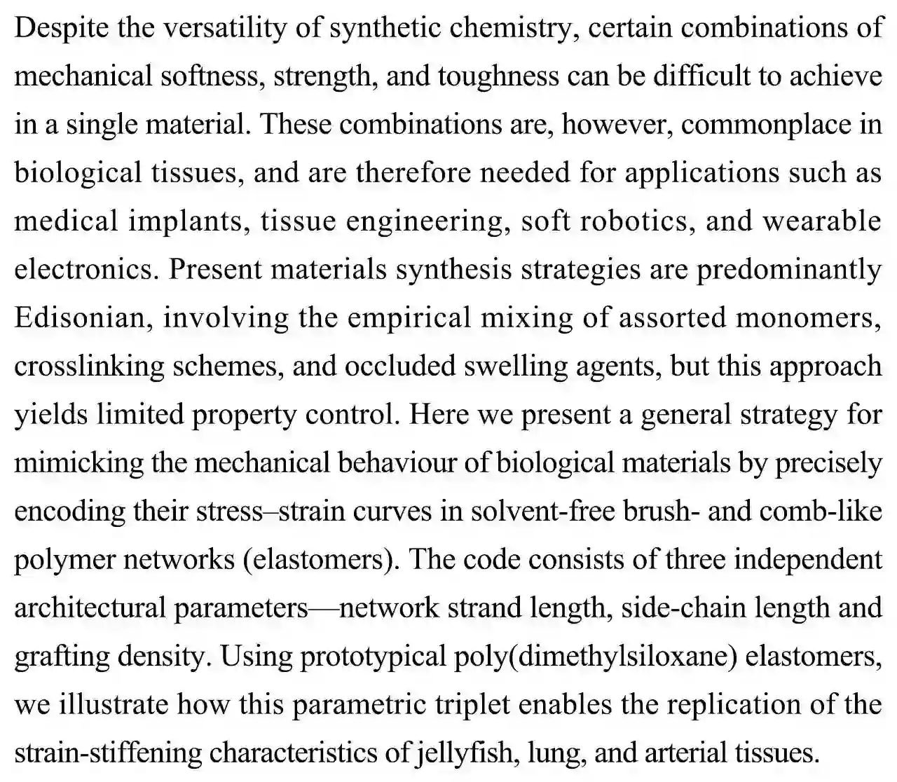 (导读 张奕林)在某种人造材料中模仿生物组织,同时保证材料的柔性、弹性与强度符合要求一直是合成化学的难题。本研究介绍了一种指导合成模拟生物材料机械性能的普适方法,该方法精确地将材料的应力-应变曲线体现在无溶剂的刷状或梳状聚合物网络(人造橡胶)中。研究人员利用原型聚(二甲基硅氧烷)人造橡胶,重现了诸如水母、肺部和动脉组织中的应变硬化特性。