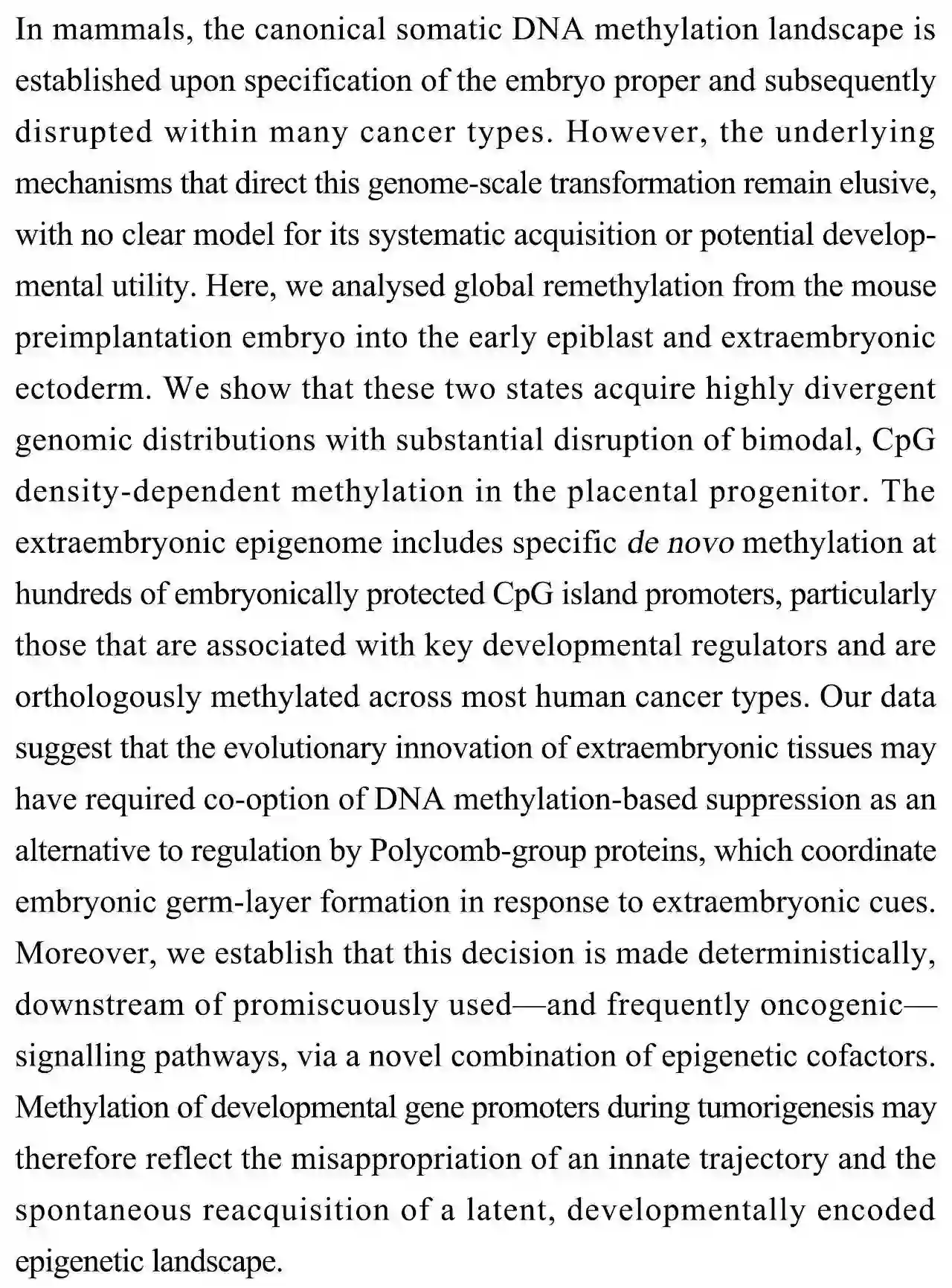 (导读 郭怿暄)哺乳动物中,体细胞 DNA 甲基化景观在胚胎阶段建立完成。但在多种肿瘤中出现异常,其机制尚不明确。本研究通过分析小鼠植入前胚胎分化成上胚层以及胚外外胚层的 DNA 甲基化,发现胚外组织的甲基化景观与多种癌细胞类似。胚外组织采取一种基于 DNA 甲基化的抑制手段作为备选来调节多梳蛋白以配合胚胎各胚层形成,暗示肿瘤发生中发育基因启动子的甲基化可能应用了胚胎发生相似机制。