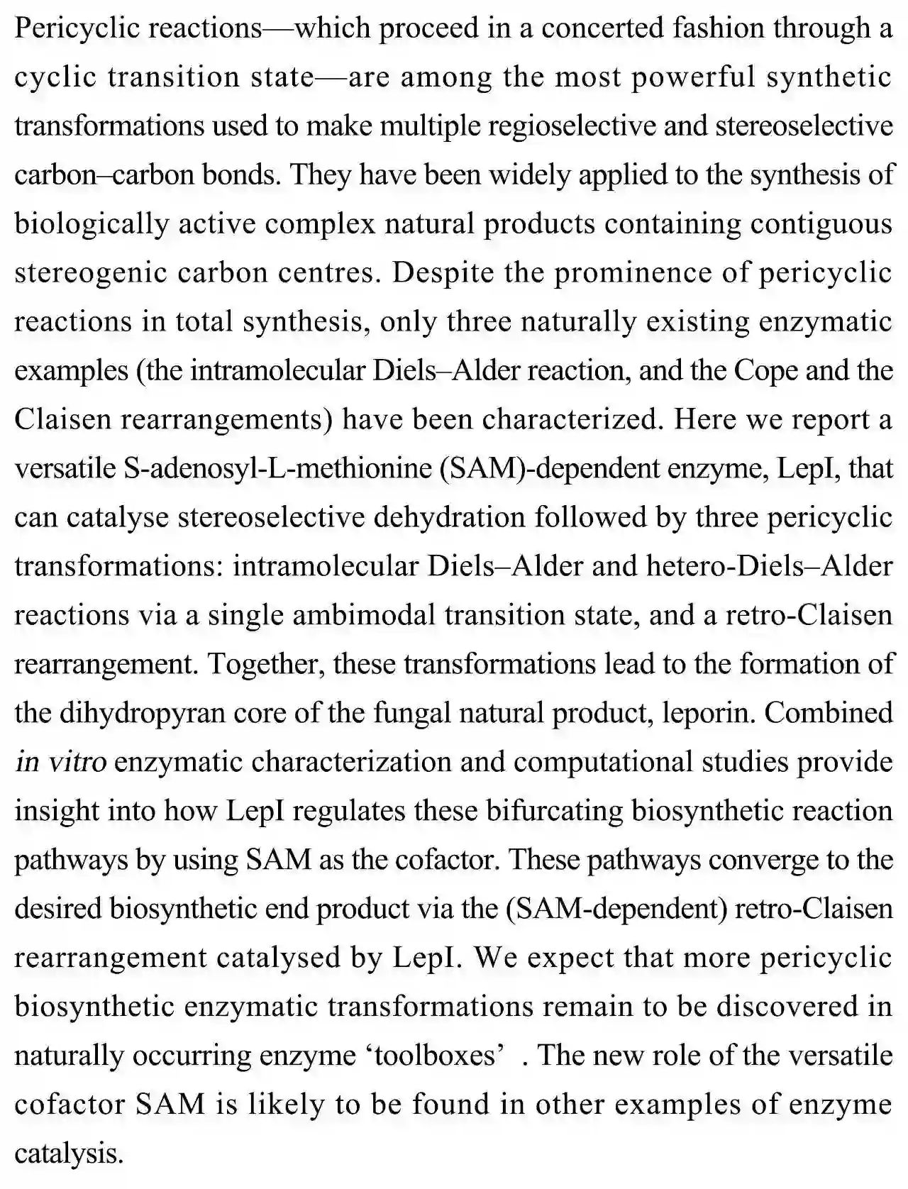 (导读 阿金)周环反应是过程中能形成环状过度态的协同反应,目前可催化此类反应的酶的数量不多。本研究报道一种 S-腺苷甲硫氨酸(SAM)依赖的多功能酶 LepI,能催化 Diels–Alder 和杂 Diels–Alder 等一系列环加成反应和 retro-Claisen 重排反应,完成天然产物 Leporin 的生物合成。因此,辅因子 SAM 在酶催化反应中更多的新功能有待进一步发现。
