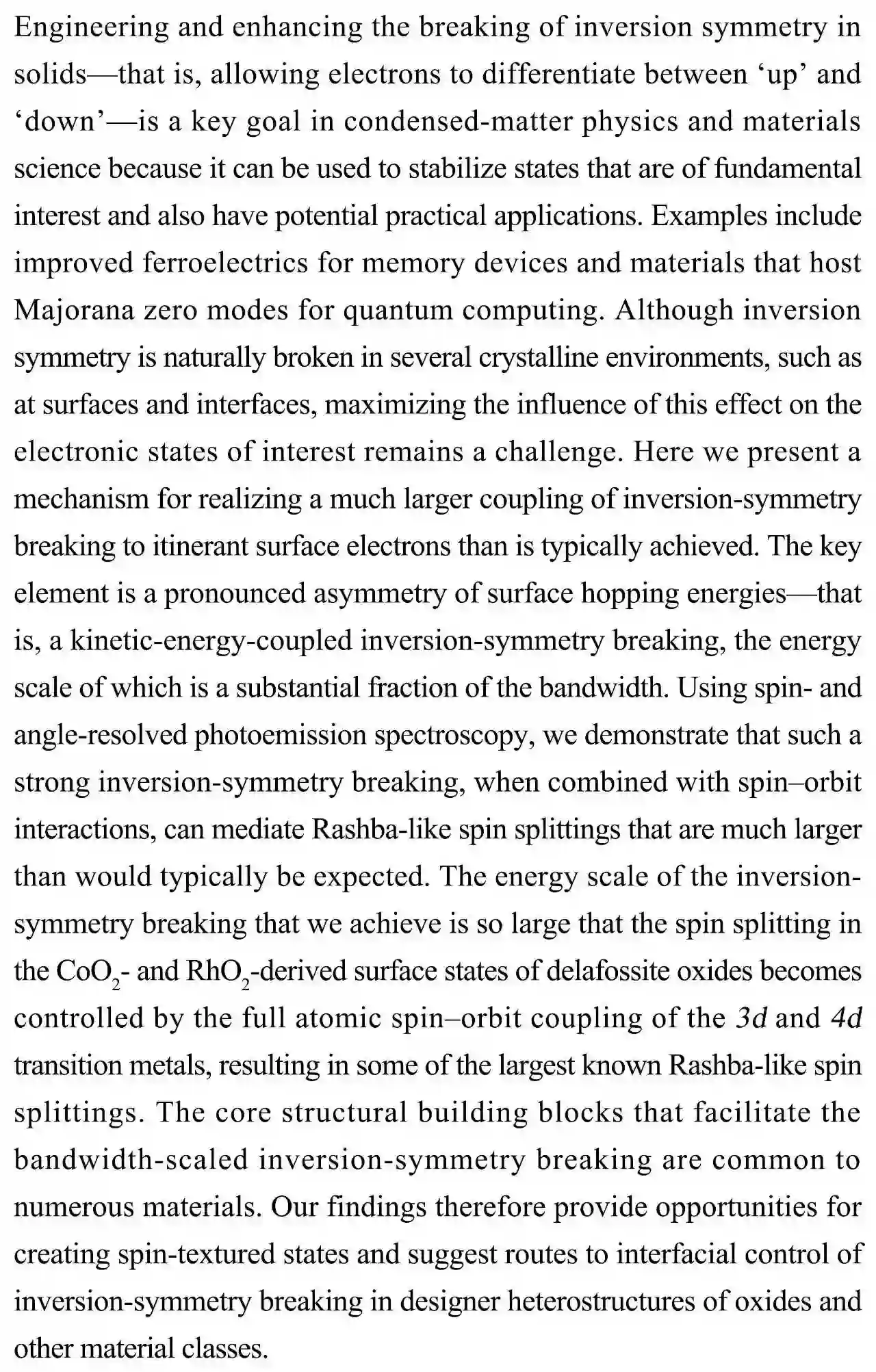 (导读 张奕林)调制和加强固体的反演对称破缺——即让电子分出“上”和“下”——是凝聚态物理和材料科学中的重要目标。本研究展示了实现反演对称性破缺与巡游电子超大耦合的机制,其关键在于动能耦合反演对称性破缺。研究人员借助自旋角分辨光电子发射谱,阐述了这一强反演对称性破缺与自选轨道耦合相结合,可极大地介导类 Rashba 自旋劈裂。这为在氧化物和其他材料中构建自旋结构态提供了可能性,并揭示了在设计异质结时调控界面反演对称性破缺的途径。