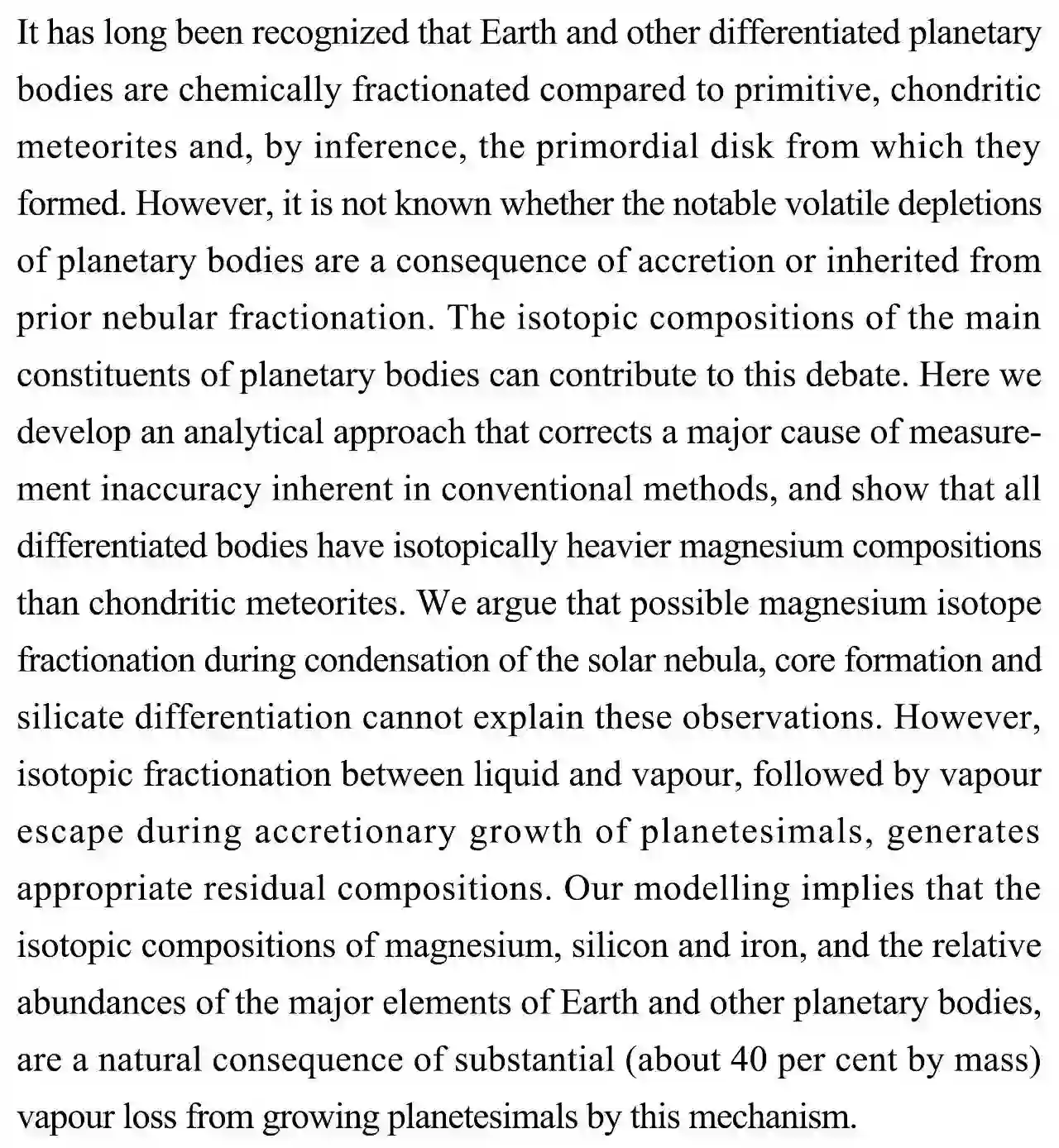 (导读 刘晓娟)地球和其他的行星体均存在化学分馏,但目前对行星体的挥发性消耗机制还不清楚。本研究提出了一种解决测量误差的方法,结果表明行星体具有比粒状陨石更重的镁同位素。镁、硅和铁的同位素组成以及地球和其他行星体的主要元素的相对丰度很可能是星球成长过程中大量蒸汽损失的自然结果。