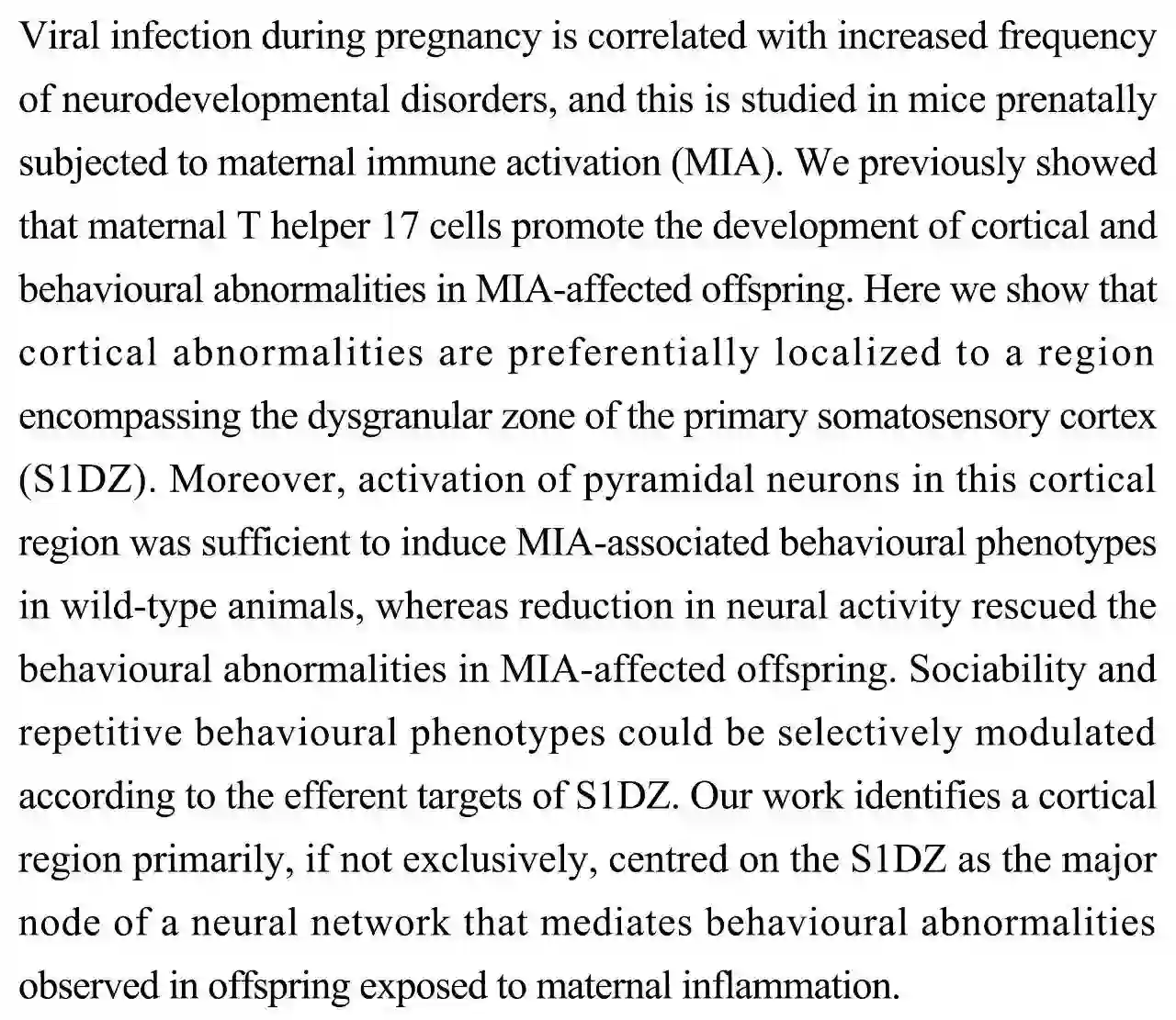 (导读 郭怿暄)孕期病毒感染与神经发育疾病发生频率上升有关。本研究发现在母体免疫激活(MIA)的小鼠后代中出现的皮质异常集中在大脑的异颗粒区初级躯体感觉皮质部位。使正常小鼠该区域锥形神经元兴奋可诱导出现 MIA 相关行为表型,抑制神经活性可改善 MIA 小鼠的后代行为。这一工作首次发现了介导这一行为异常神经网络的主要节点。