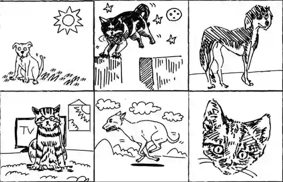 我们都知道狗和猫是什么,它们是什么样子,它们的行为,我们通常在什么环境下看到它们,等等。但人工智能必须从头开始,没有对真实世界的预想,也不可能有什么图像。就好像Bob和Alice都是在一个封闭的房间里长大的,他们闭着眼睛,第一次看到真实的世界,通过照片展示出来。他们绝对没有“狗”或“猫”的概念,在游戏开始的时候,猫的照片看起来很有可能像随机噪声或抽象画一样。