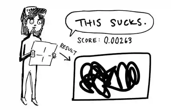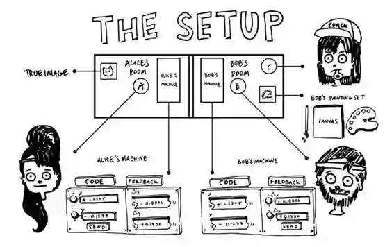 起初,由于Alice从未见过真正的照片,也不知道Bob会喜欢什么代码,所以她所能做的就是发送给Bob随机数。而且,Bob不知道这些数字意味着什么,也不知道他预计会创作什么样的画作。从字面上看,任何一幅画都和其他画一样,是随机的。但是在创作了许多随机的画作之后,Bob开始注意到一些东西。当他在他的绘画中心使用某些颜色,而其他一些在边缘的时候,他的分数会稍微高一些。特别是当他在中间画一个灰色或棕色的圆圈时,他通常会得到比他完全随机画出的更高的平均分。