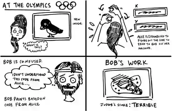 他们如何做到这一点呢?有无数的代码可以让他们这样做,我们来考虑一个特别简单的方法。我们之前假设有100万个训练图像。考虑到这些知识,他们可能会同意从第一个0.000001开始编码,第一个0.000002,第100万的编码是1.000000。对于每个图像,它们只是决定一个唯一的代码编号。在这段代码中,连续编号的图像与它们的代码非常接近,但是图像至少不需要相似。图156可能是一只在客厅玩球的黑狗,图像157可能是一只白色的猫在草地上追逐老鼠。每当Alice看到图像156,她就发送0.000156。Bob已经知道了他需要什么才能得到一个完美的分数。同样的,当他在他的机器上看到0.000157的时候,他已经弄清楚了要画什么。这样,他们就得到一个完美的分数。但如果Bob看到0.0001565? 或-0.000001 ? 或1.000001 ? 他就不知道了。类似地,如果Alice突然出现了一个以前从未遇到过的新图像,那么她将如何将其与现有的代码相匹配,从而使Bob可以直接进行猜测呢?