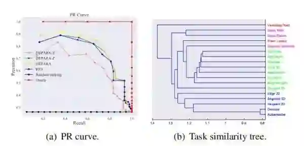 论文中采用PR曲线来评估方法效果,实验结果如上图,可以看到论文中提出的深度归因图方法(DEPARA)与taskonomy(Oracle)实验的结果具有很高的相似性,且通过消融实验可知,只采用图中节点相似性(DEPARA-V)和只采用图中边相似性(DEPARA-E)计算得到的迁移性准确度都远远不如图相似性(DEPARA),这意味着节点和边都对结果起着重要作用,是不可分割的。另外,论文中的方法(DEPARA)好于SOTA(RSA),证明了这是一种更加有效的计算迁移性的方案。