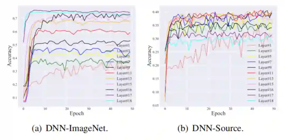 上图是层迁移实验中的训练曲线,可以看到,由DEPARA挑选出来的层,迁移效果要好于其他层。而且,相比于DNN-Source,DNN-ImageNet中的训练曲线明显更加地平滑,这也恰恰证明了迁移性越好的模型,在迁移时所花费的重训练的成本就越低,也越容易地迁移至目标任务。