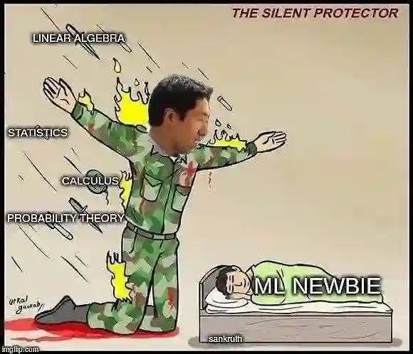 趣味哏图:「吴恩达公开课,默默为AI新丁挡下了微积分、线代、统计、概率论这些高数火力,让学子们得以安眠。」