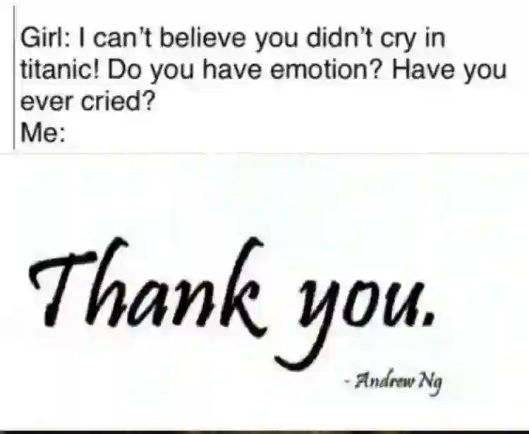 趣味哏图:「女友:你看泰坦尼克都不哭!难以置信!你究竟有没有感情!你哭过没有!AI学子:有啊,吴恩达公开课结尾出手写感谢字幕的时候。」
