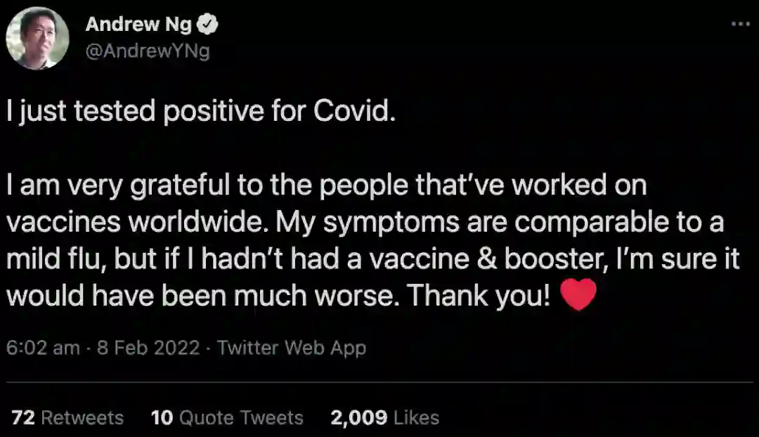 吴恩达表示,由于自己已经接种了疫苗和加强针,目前的症状和与轻度的流感差不多。感谢全世界从事疫苗工作的人们。