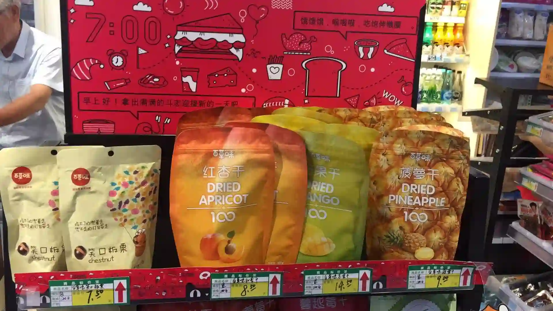 仔细观察当中一个货架上的货品,其中在线下商超渠道罕见甚至前所未有的零食品牌“百草味”和“卫龙”引入眼帘——事实上两家均以主打线上渠道电商销售而闻名。随即我们当场连线百草味相关负责人求证,得到了肯定的答复:这是其今年