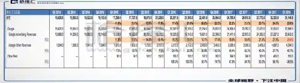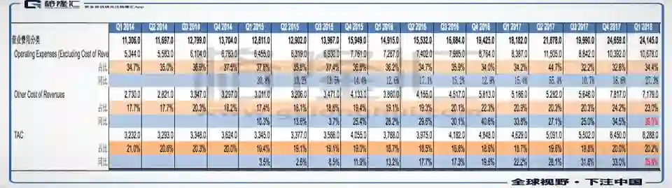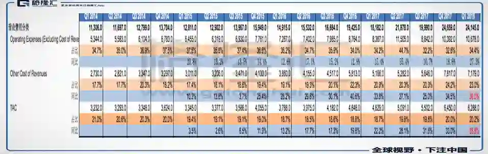 2018年Q1谷歌的流量获取成本是63亿美金,2017年Q1这个数字是46.3亿美金,同比上升36%左右。