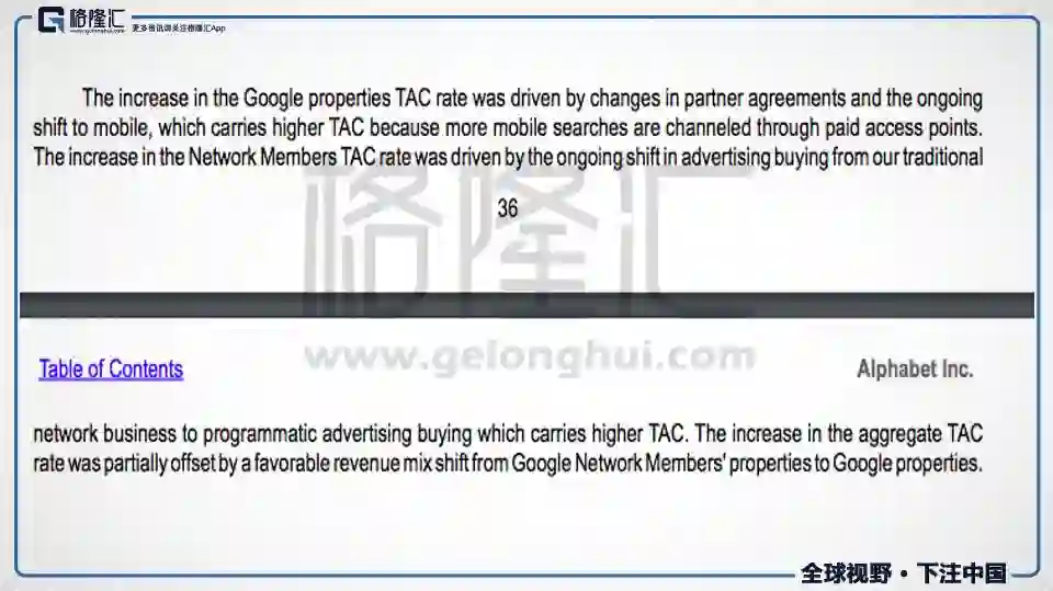 导致TAC上升的主要原因是移动端因为生态更加封闭,导致TAC rate上升,而谷歌的广告收入增长主要是来自于移动端。这就导致 TAC rate从PC 端比较低的一个数字,逐步上升到移动端比较高的一个数字。