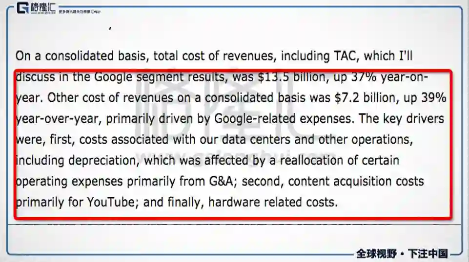 在电话会议里,管理层称,other cost of revenue的上升主要是因为谷歌部门业务的相关费用上升。
