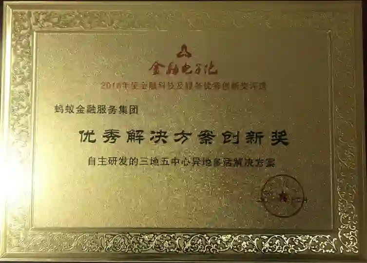 12月20日,在北京举行的“2018中国金融科技年会暨金融科技及服务优秀奖颁奖典礼”正式宣布蚂蚁金服自主研发的三地五中心异地多活解决方案获“2018年度金融科技优秀解决方案创新奖”。