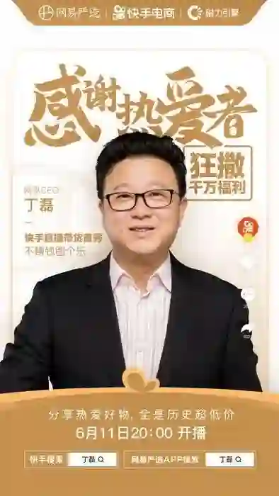 【网易CEO丁磊也要直播带货了】快手方面确认,6月11日晚8点,网易CEO丁磊将在快手直播带货网易严选和网易的味央猪。时值网易上市20周年,当天又是网易在港交所二次上市,丁磊选择在快手直播带货的形式庆祝。快手将在网易提供的超大力度折扣基础上,再给予大额补贴,“价格极具冲击力”。直播当天丁磊将抽取20位幸运“锦鲤”送出价值135万的网易“热爱一生”终生大礼包,含网易严选、网易云音乐、有道、网易邮箱等多个产品的100年会员卡。