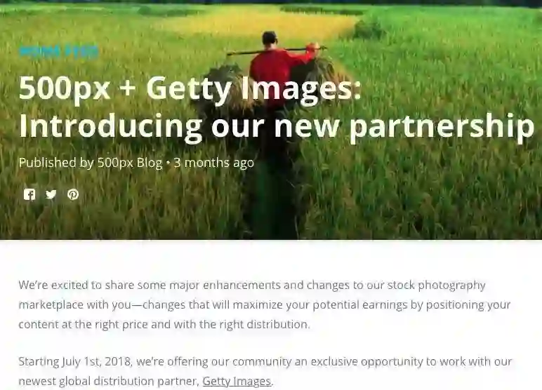 收购后不到半年,当用户再登陆500px时会看到这样的提示:“500px的Marketplace(500px的直接销售平台)已经关停,现在500px的图片只能在Getty和视觉中国购买。”实际上,从2018年7月1日起,视觉中国负责500px在中国的业务,而500px的国际销售业务则全权交由Getty代理。又是Getty!
