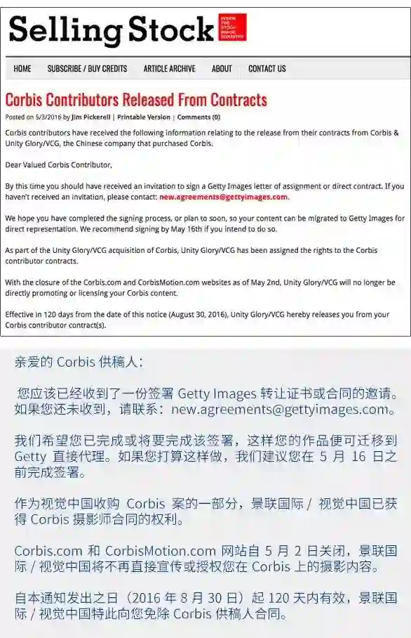 2016年4月底,视觉中国联合Corbis给Corbis签约摄影师们发去了一封邮件,通知他们Corbis网站将关闭,并解除Corbis与摄影师之间的签约合同,Corbis不再和摄影师合作。视觉中国和Corbis在邮件中告诉签约摄影师,只要签署已经收到的签约Getty合同,摄影师作品就将迁移至由Getty直接代理。