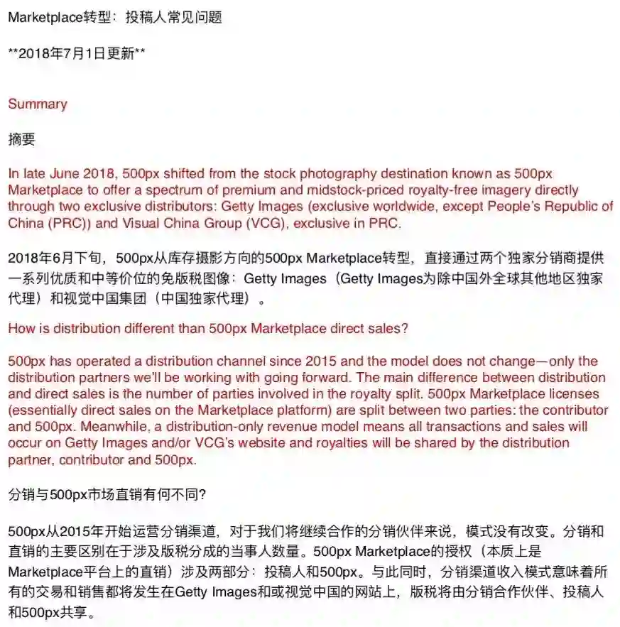 视觉中国收购后的500px在官网披露了一份“投稿人常见问题解答”。该文称,Marketplace以往表现不尽如人意,决定关停直接销售平台,完全选择由他方参与分成的分销模式。