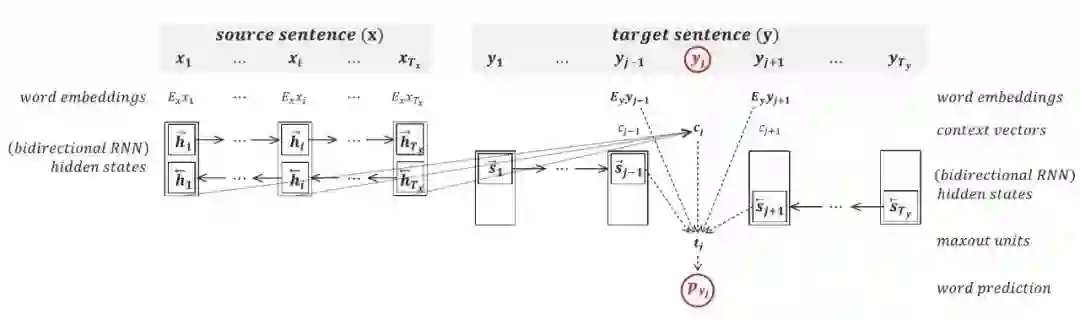 如下对于原语句子 x,模型首先将每一个词都表征为词嵌入向量,然后再馈送到正向和反向两条 LSTM,每一个时间步需要同时结合正向和反向 LSTM 的隐藏状态并作为最终的输出。对于目标语句子 y,在第 j 个词之前的序列使用正向 LSTM 建模,而第 j 个词之后的序列使用反向的 LSTM 建模。最后在预测第 j 个词时,需要使用原语句子 x 的上下文向量 c_j(由注意力机制得出)、目标语前一个词及前面序列的语义信息、目标语后一个词及后面序列的语义信息。