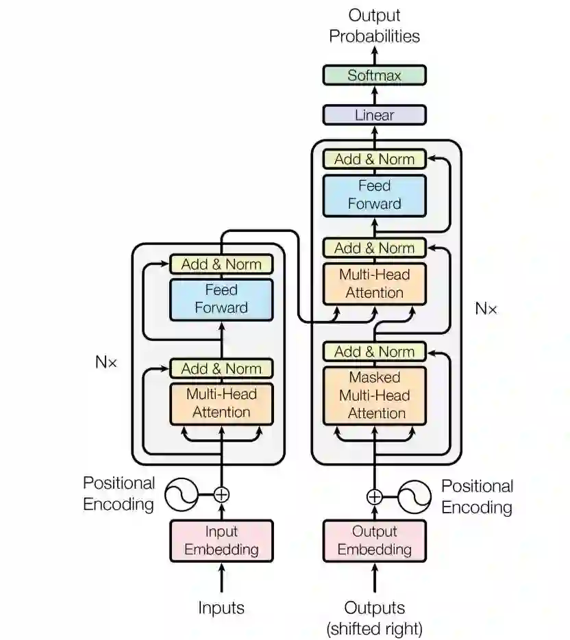 上图所示为 Transformer 原论文中介绍的网络架构,阿里机器翻译团队将其采用为『双语专家』条件语言模型的基础网络。Transformer 编码器的 Inputs 为原语句子序列 x,解码器输入的 Outputs 为目标语正向和逆向两个序列。此外,解码器中 Softmax 输出的概率表示目标端当前词预测。在阿里采用的架构中,编码器和解码器的层数都等于 2,即图中的 N=2。