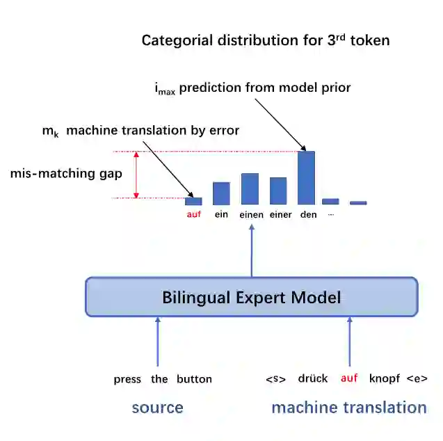 总体而言,在阿里的模型中,利用预先训练的专家模型,先抽取基于模型隐层的一些 high level 表示信息,以及该词的前后词的词向量,最后再通过一个全连接层做一次线性变换。除此之外,阿里还构造了 mis-matching features。如下图所示,当某个翻译结果错误单词不多的时候,预训练模型会给出正确的单词预测分布,这和翻译结果激活的单词会存在一个 gap。这个 gap 是一个非常重要的特征,阿里机器翻译团队的实验显示就算只用这个特征去做下一步预测,也可以得到很好的结果。详细内容可以参考阿里机器翻译团队的论文:“Bilingual Expert” Can Find Translation Errors [1]。