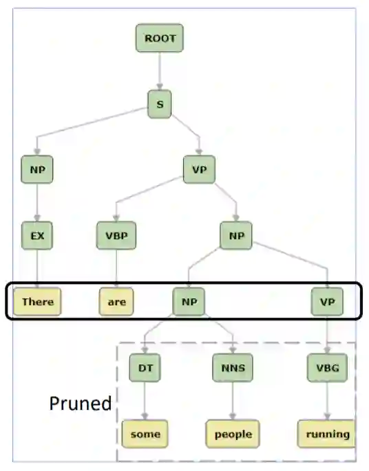 选择子树的深度是一个权衡。在图3中,当深度等于1是一种特殊的情况,此时模板仅具有一个符号 S。模板 S 无法提供任何有用的信息。另一个特殊情况是当深度大于6时,“There are some people running” 此时模板只有终端节点。该模板仅包含目标语言单词,不能提供任何其他信息。而当深度等于4时,模板为 “There are VP NP”。该模板包含句子句法和结构信息,适用于我们的方法。