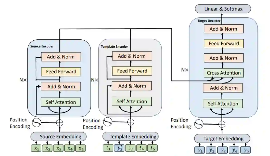给定三元组训练数据(源语言文本,目标语言文本,软模板)后,我们使用源语言文本和软模板生成目标语言文本如下公式。源语言 Transformer 编码器和软模板Transformer 编码器将输入序列 X 和由目标语言单词和非终端节点组成的模板 T 映射到隐层向量。然后,与两个编码器交互的 Transformer 解码器生成最终翻译 Y,即: