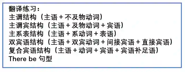 通常我们在进行造句训练的时候,最开始老师会教给我们一些句型,例如 “sb. like doing sth; There be...” 等,然后让我们做练习。下图是一个中英翻译训练教材的内容,要求根据以下句型将中文翻译到英文。
